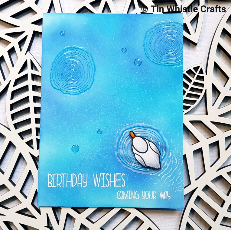 I had an idea to use a tulle see through window (well not a new idea but a new technique to me!). Because it made me think of floating I thought the My Favorite Things space themed stamp sets I have would be perfect. I used the Out of This World set for the stars and sentiment and Space Explorer for the rest of the images. The circle was die cut with the Dienamics Inside Out Stitched Circle die.