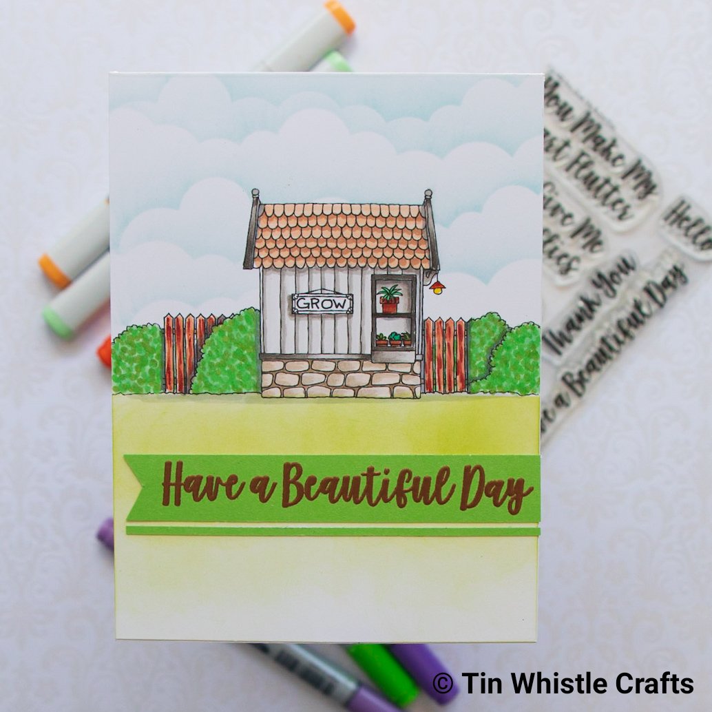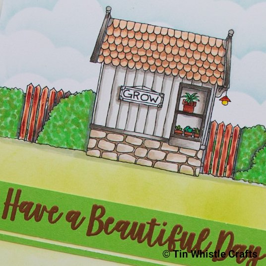 All the images were printed with my inkjet printer onto copic friendly cardstock so I could colour them all with alcohol markers. The potters corner files comes with each item separated so you can build the scene as you want. On the front of the card I added the pot plants in the window and the grow sign onto the front of the shed. As I wanted the scene to be a smaller size the fence didn’t reach the edge of the panel so I freehand drew three more bushes to fill out the scene.