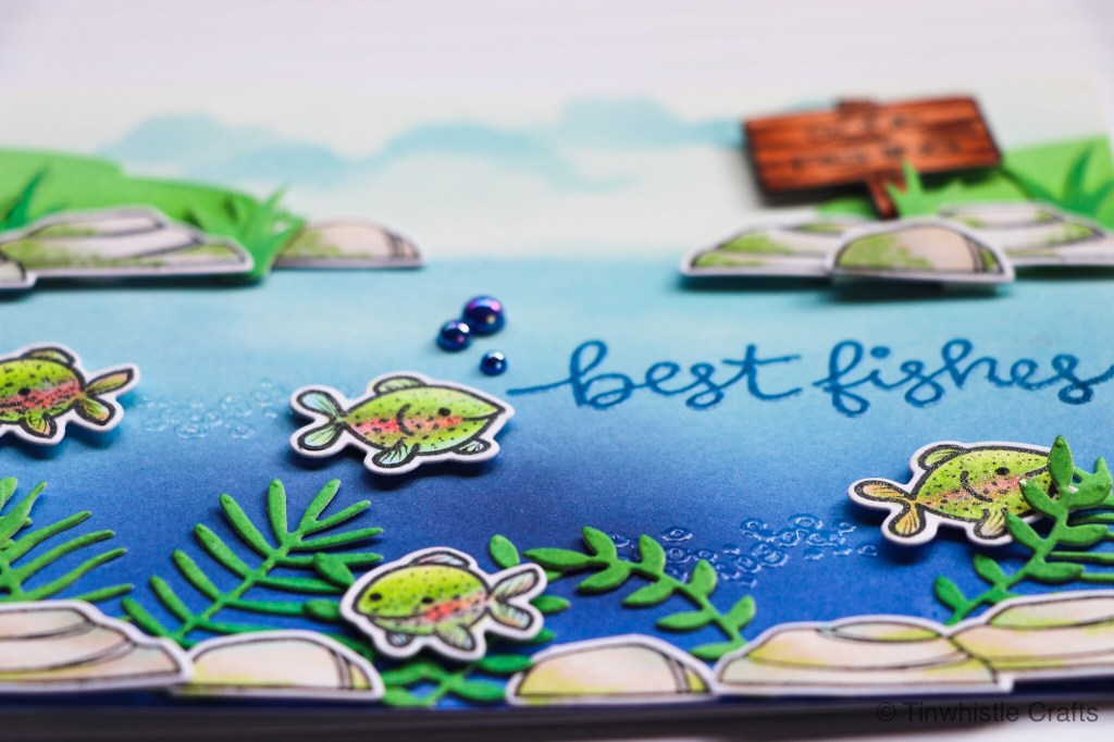 - I used the pond die cut Lawn Fawn – Bayou Backdrop to create the banks of the river.