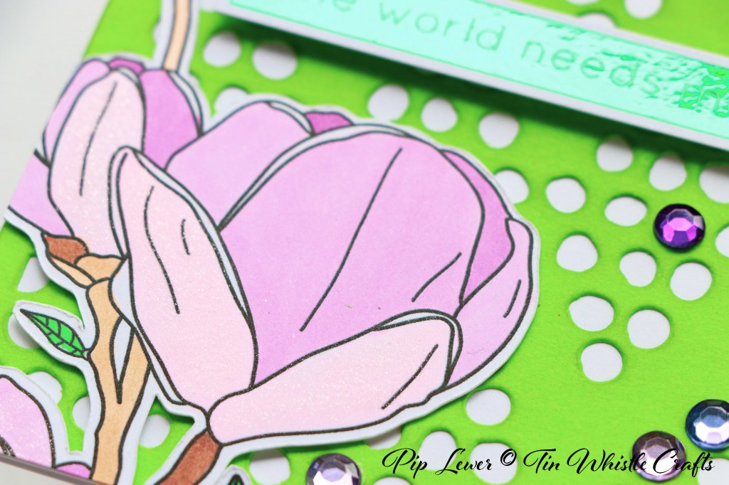 - I cut the sentiment out, keeping a small border to match the border around the magnolias and adhered it to the cardbase with adhesive backed craft foam.