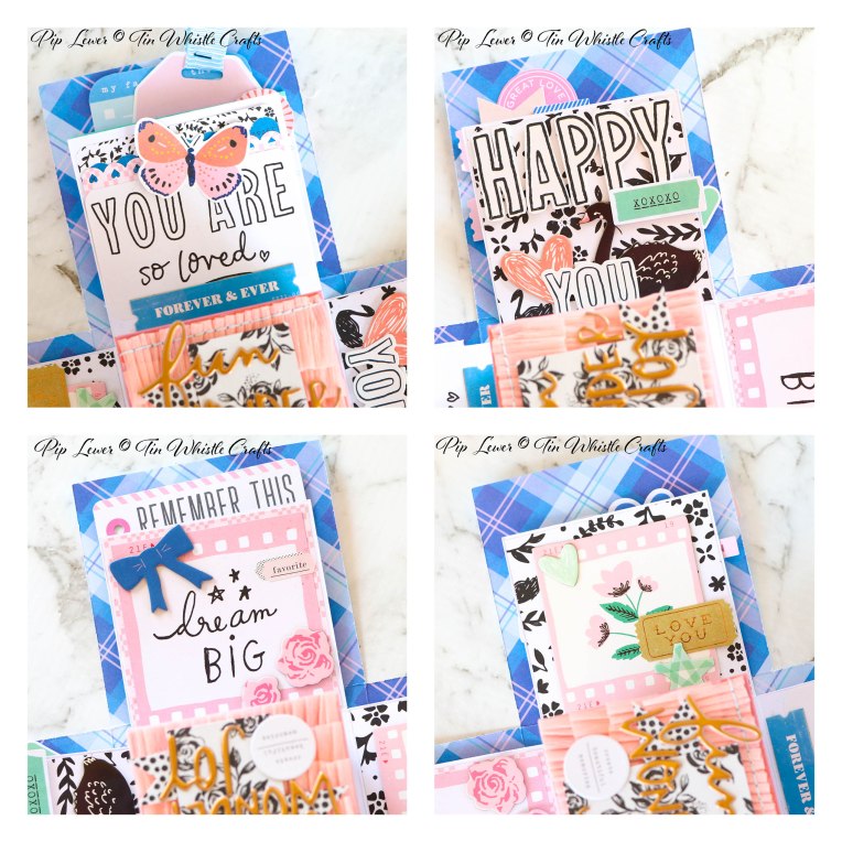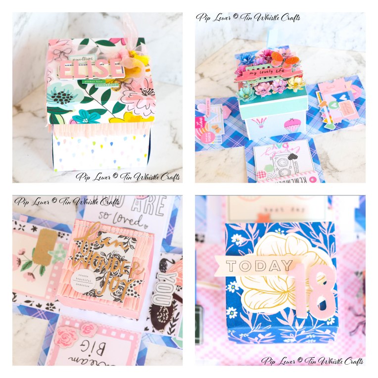 Here is the second birthday exploding box made a few months ago for 18 year old twins. I used the We R Memory Keepers explosion board, making 4 boxes in total. The small inner box was fixed so it could be used for adding a small keepsake rather than folding down.