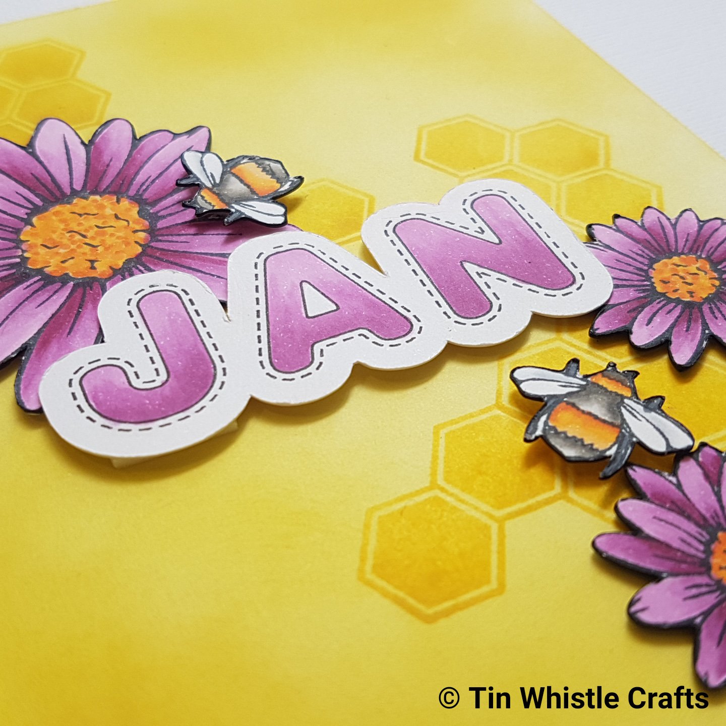 I had designed the name with my Scanncut using the draw and cut feature and coloured with copics. The flowers and bees were stamped on copic friendly cardstock with Momento Tuxedo Black Ink and coloured with the following copic colours.