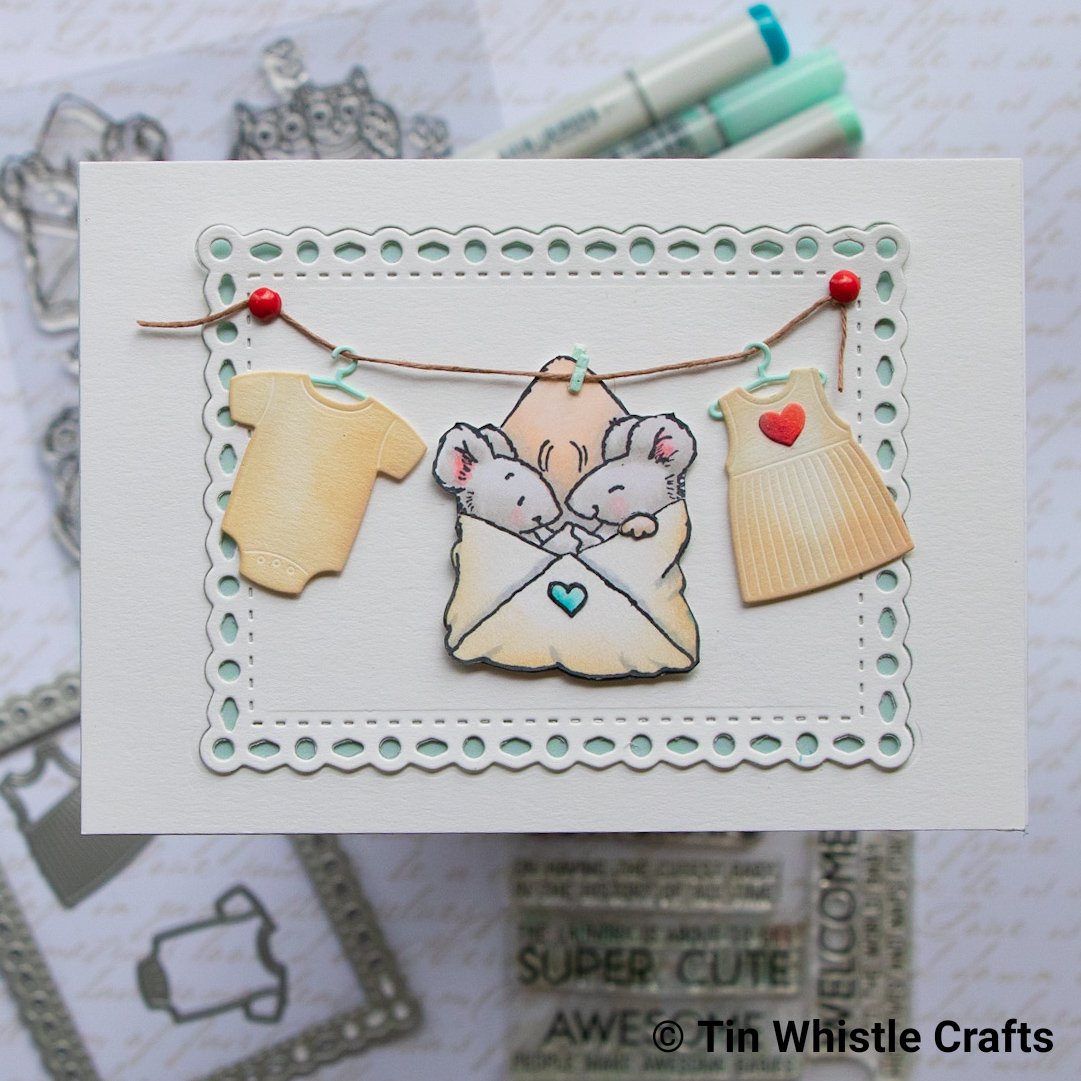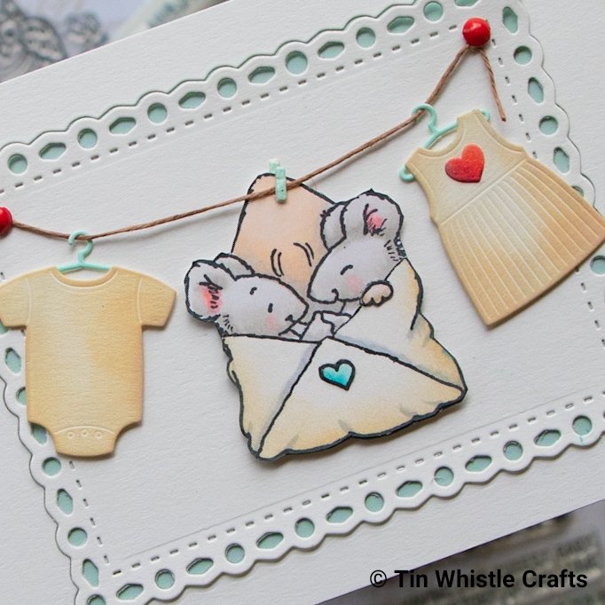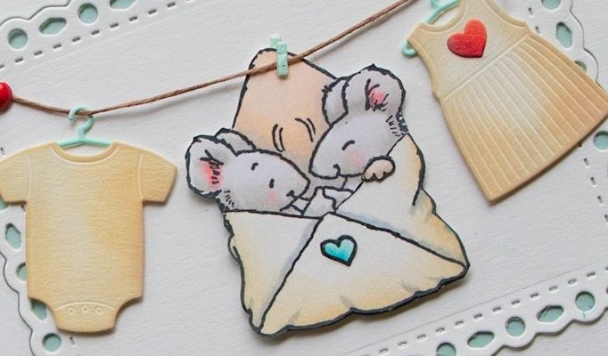 Diecut the baby clothes, My Favorite ThingsBundle of clothes, out of Snow White cardstock and blend Distress OxideTea Dye over outside portions of die cuts.