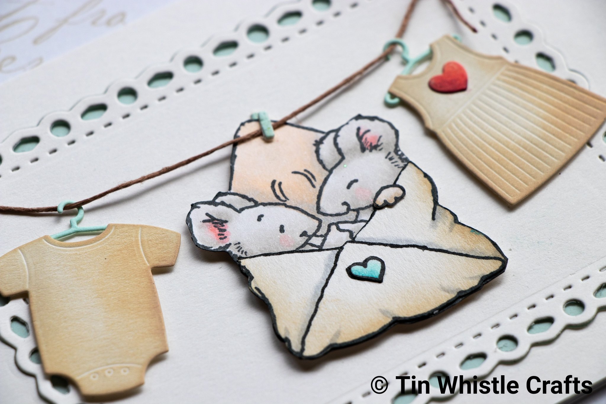 Diecut heart, hangers and pegs pieces out of white cardstock and colour with matching copics.