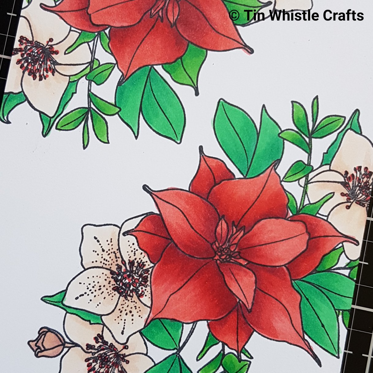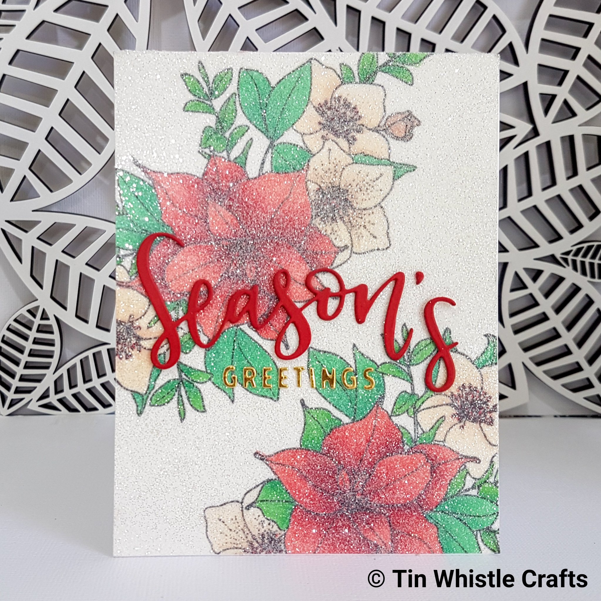 I used the Christmas Rose Bouquet from WPlus9 and the dies from Concord & 9th Season of Cheer. After colouring the image that I had stamped twice onto copic friendly cardstock all that was left to do was complete the frosting technique.